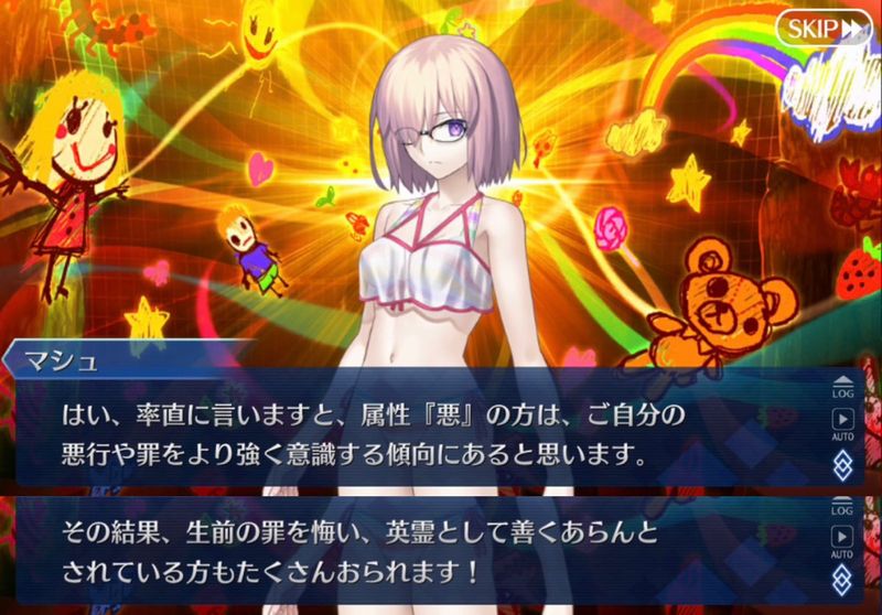 混沌・中庸申告しても普通に混沌・悪ですな若モリアーティ、異聞帯の王の自分とは違うから混沌・善申告してそのまま通るスカディ見ると本心からそう考えてるのは大事なんだろうな。人殺しなんて悪い事でしょな小次郎とか見ると尚更。
