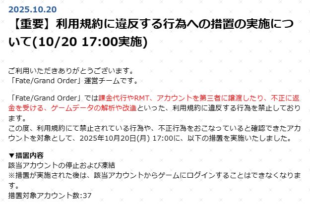 他のゲームだとそういう黒的な存在でもアクティブや売上の足しになるから普通にお咎めなしなんだけどFGOはサービス開始からずっとこういう存在BANし続けてるよね